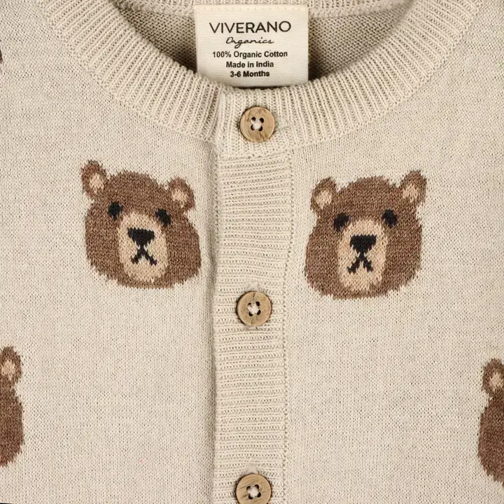 100% organic cotton baby sweater, featuring brown bear jacquard design. - Breathable organic cotton, comfy and cozy. - Eco-friendly, chemical free and non-toxic, good for baby's delicate skin. - Machine washable, durable and long lasting. - Eco-friendly, chemical free, non-toxic, pure, natural & organic baby clothes. - Ethically produced in India, supporting better livelihoods for small grower farmers. Viverano, an American brand, was founded in 2013 with the simple idea of producing eco-friendly, pure and organic baby clothes. Viverano baby clothing is known for its soft hand feel and high quality. Pamper your precious babies with our non-toxic, lightweight, all-season, natural baby outfits. Experience 'Organic Comfort' by Viverano, a family-owned small business.