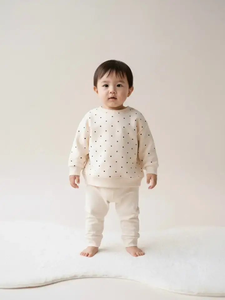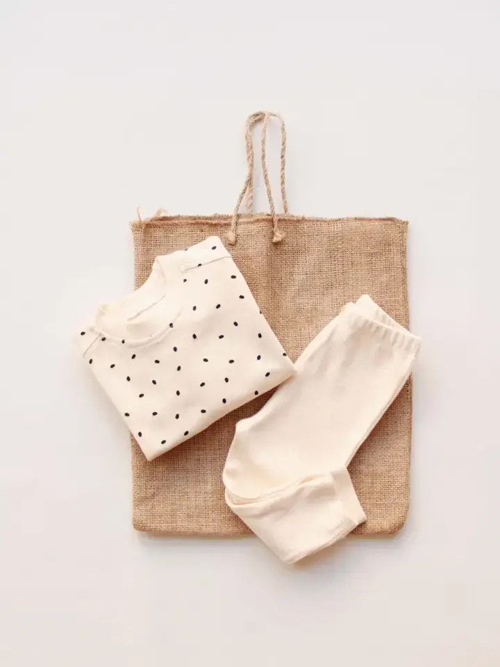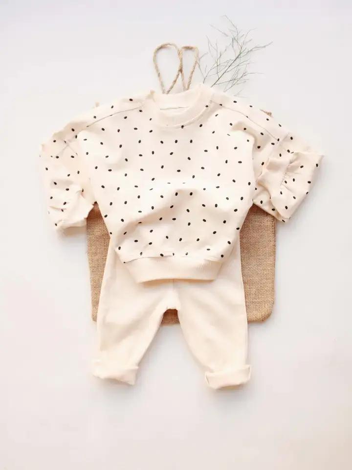 The Coco Dot Set is a cozy everyday essential with a modern minimalist twist. This soft beige baby outfit features a long-sleeve sweatshirt with tiny black polka dots and matching elastic-waist pants. Crafted from ultra-soft cotton for comfort, it’s perfect for lounging, playing, or naptime. Ethically made in Turkey from breathable, baby-safe fabric that keeps your little one cozy all day long. Details and Care * Made in Turkey * 100% Cotton * Machine wash cold, line dry * Free Shipping