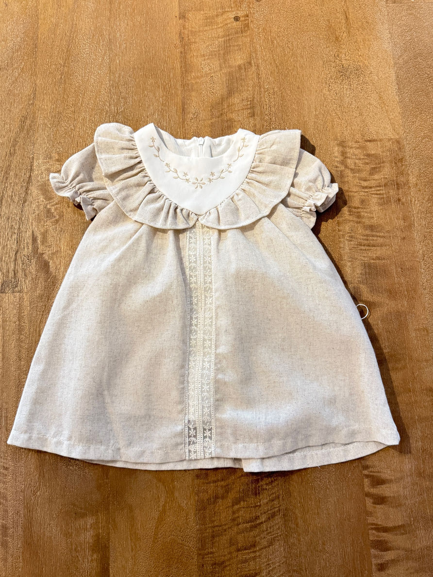 Dress your little one in timeless charm with this beautifully made baby dress in a soft, natural beige tone. Featuring a sweet ruffle collar with delicate floral embroidery and puffed short sleeves, this dress blends vintage elegance with everyday comfort. The soft, breathable fabric is gentle on baby’s skin, while the lace trim down the front adds a lovely handmade touch. Perfect for special occasions, family gatherings, or just looking adorable on an ordinary day. Details and Care * Made in Turkey * Outer Lining: 50% Cotton, 10% Linen, 40% Polyester * Inner Lining: 100% Cotton * Tulle: 100% Polyester * Dry clean only