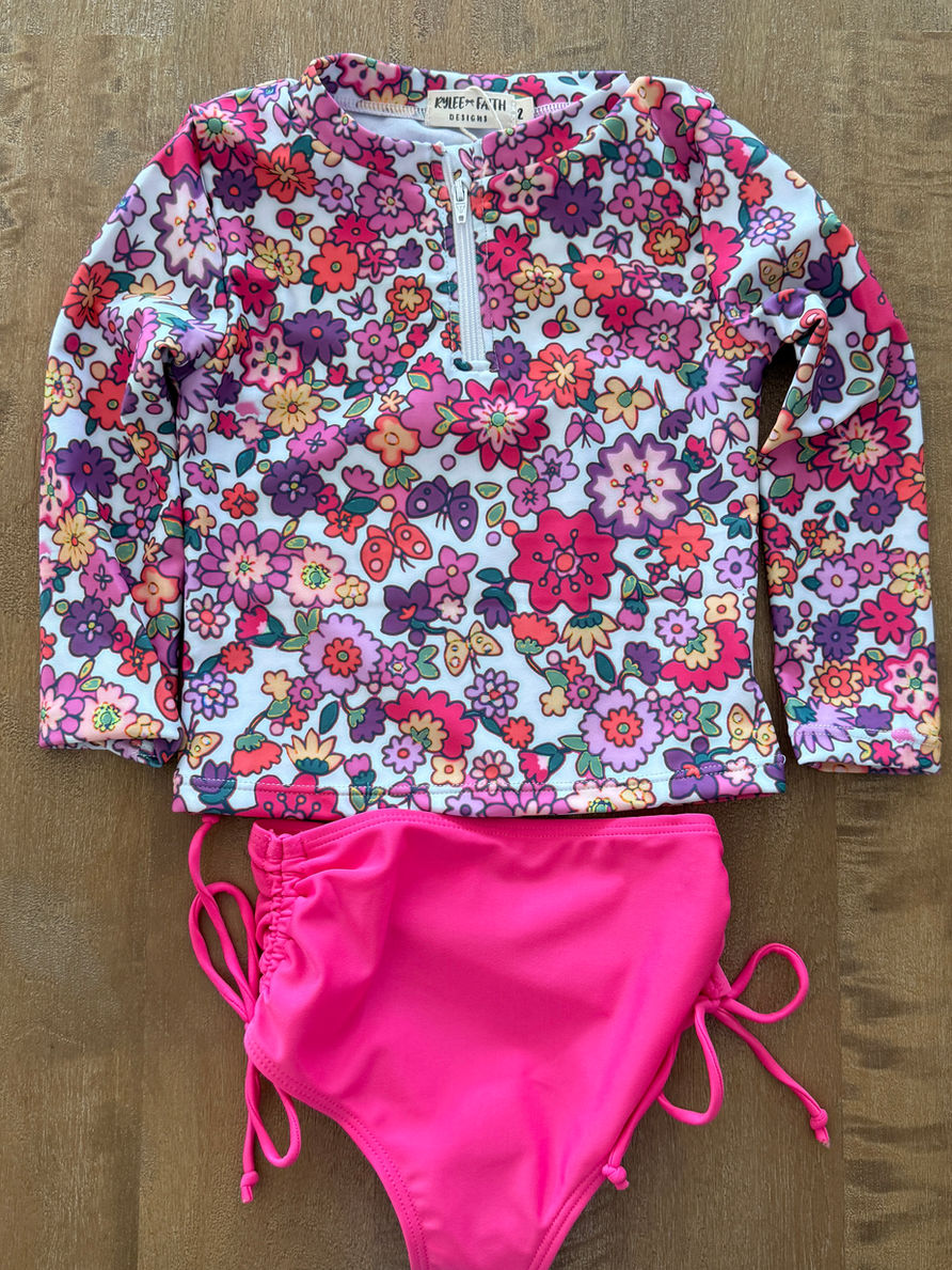 Hot Pink Summer Floral Girls Long-Sleeved Swimsuit Set