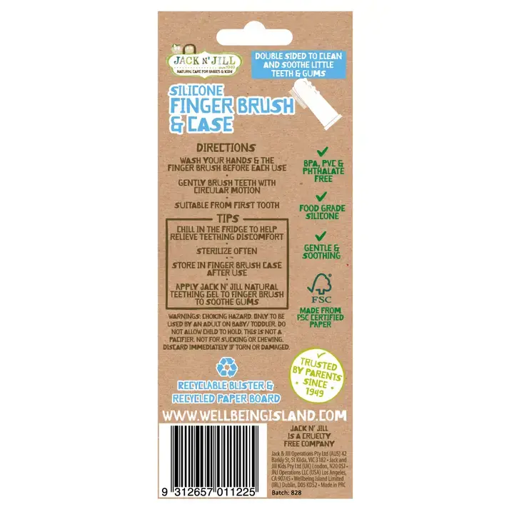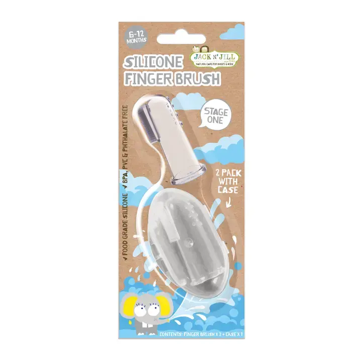 Made from food grade silicone, the Jack N’ Jill Silicone Finger Brush has been designed for a simple and effective start towards good oral hygiene from 6 months +. Easy to use, gentle on gums and BPA Free, the Silicone Finger Brush is suitable for use with Jack N' Jill Natural Certified Toothpaste and convenient for travelling. This is also an excellent choice when used with the Natural Teething Gel! • Silicone Finger Brush two pack with case • Stage 1 suitable for approx. 6 - 12 months • Double sided to gently clean and soothe little teeth & gums • BPA, PVC & Phthalate free • Recyclable blister & paper board packaging Tip: Always make sure your Jack N' Jill Silicone Finger Brush is clean. Wash with warm soapy water. Safe to sterilise. Store in a clean container. Pop in the freezer to use when baby is teething! Of course, only to be used by an adult on baby/children. This is not a pacifier or teething device. Not for chewing! Discard immediately if torn/damaged.