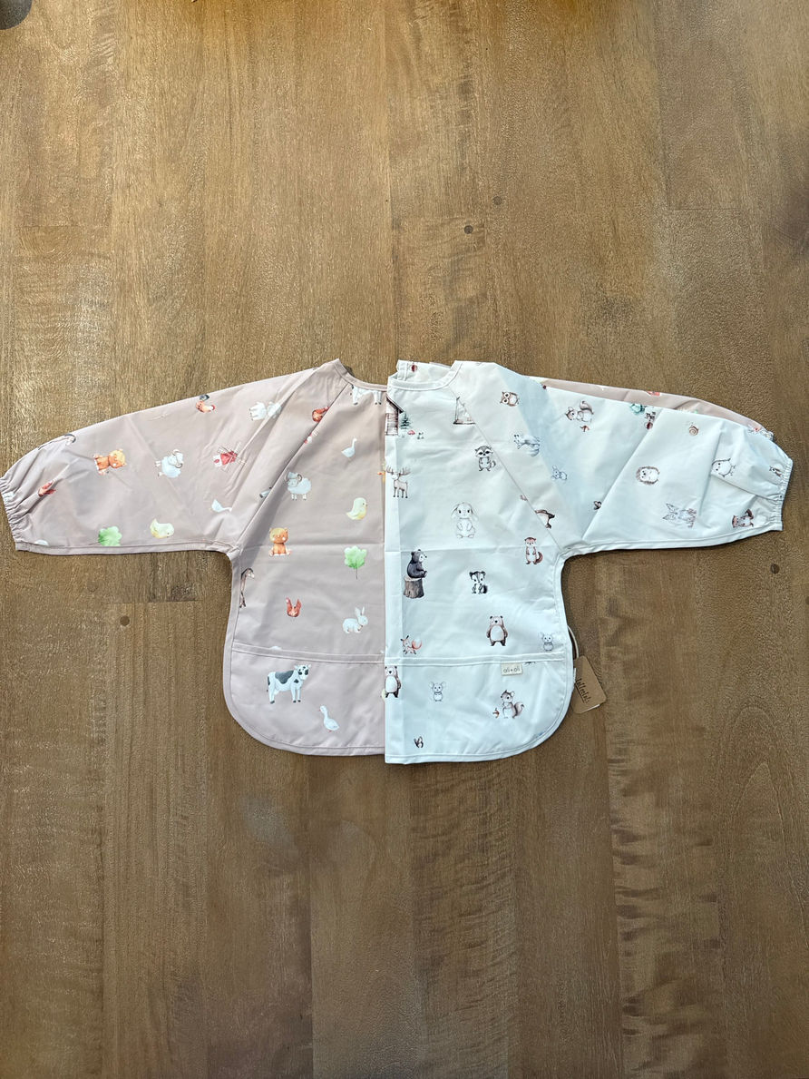 Our Oeko-Tex certified smock bibs are made of 100% recycled polyester material, which makes them durable and easy to clean. The waterproof design ensures that your child's clothes stay clean and dry during mealtime, painting, or any other messy activity. With its adjustable neck hook & loop closure, the smock is easy to put on and take off and fits comfortably on your child. Ages: 6-24 months Long Sleeve Bib: (13" wide x 15" long) Pocket: 4" deep Velcro Neck Closure Elastic sleeve opening 100% polyester Wide pocket mess catcher 100% Recycled Polyester. Ultra-soft. Delicate on your baby's precious skin Wipe clean after each use. Wash at max 30ºC (80ºF) and lay flat to dry. Do not tumble dry, bleach, iron or dry clean.